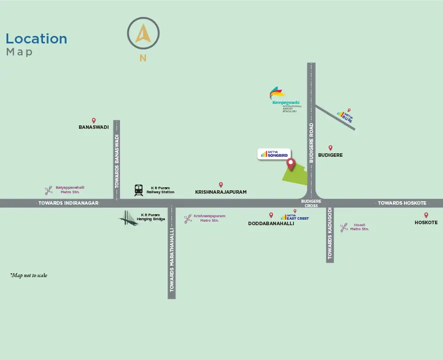 Located off Old Madras Road at Budigere Cross, Sattva Songbird offers the best of both worlds – accessibility and quietude. Enjoy seamless access to major hubs, with metro stations, IT parks, schools, hospitals, and shopping centres all within a short drive.