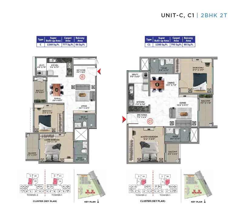 2 BHK: ~1280 sq.ft. | 3 BHK: