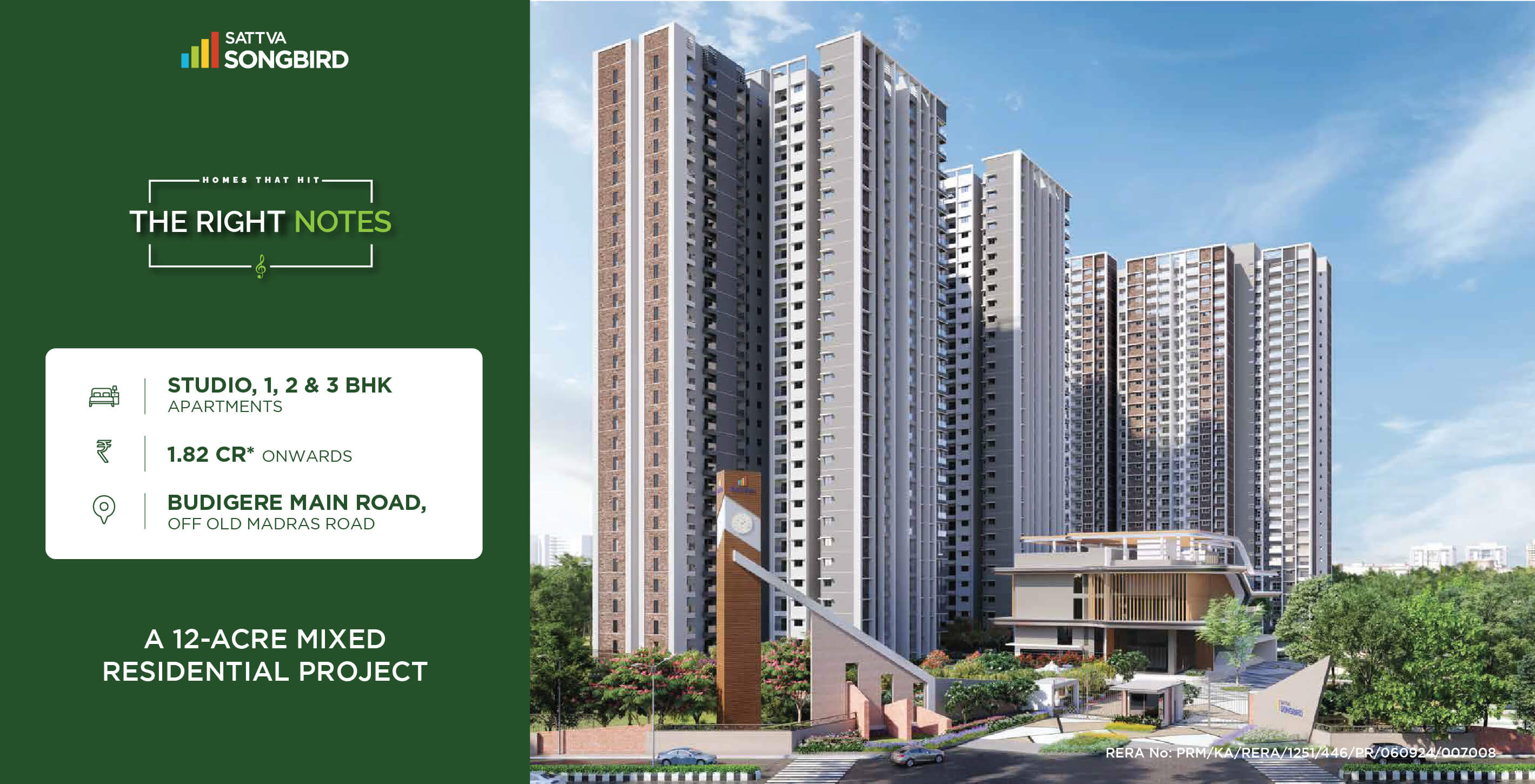 Nestled across 12 serene acres off Budigere Main Road, Sattva Songbird is a premium residential community offering Studio, 1, 2 & 3 BHK apartments starting at ₹ 1.82 Cr. Designed for those who seek elegance and tranquility, the project harmonizes luxurious living with nature. Comprising four well-planned towers, it features thoughtfully designed homes, exceptional amenities, and vibrant community spaces – all in a beautifully landscaped environment.
