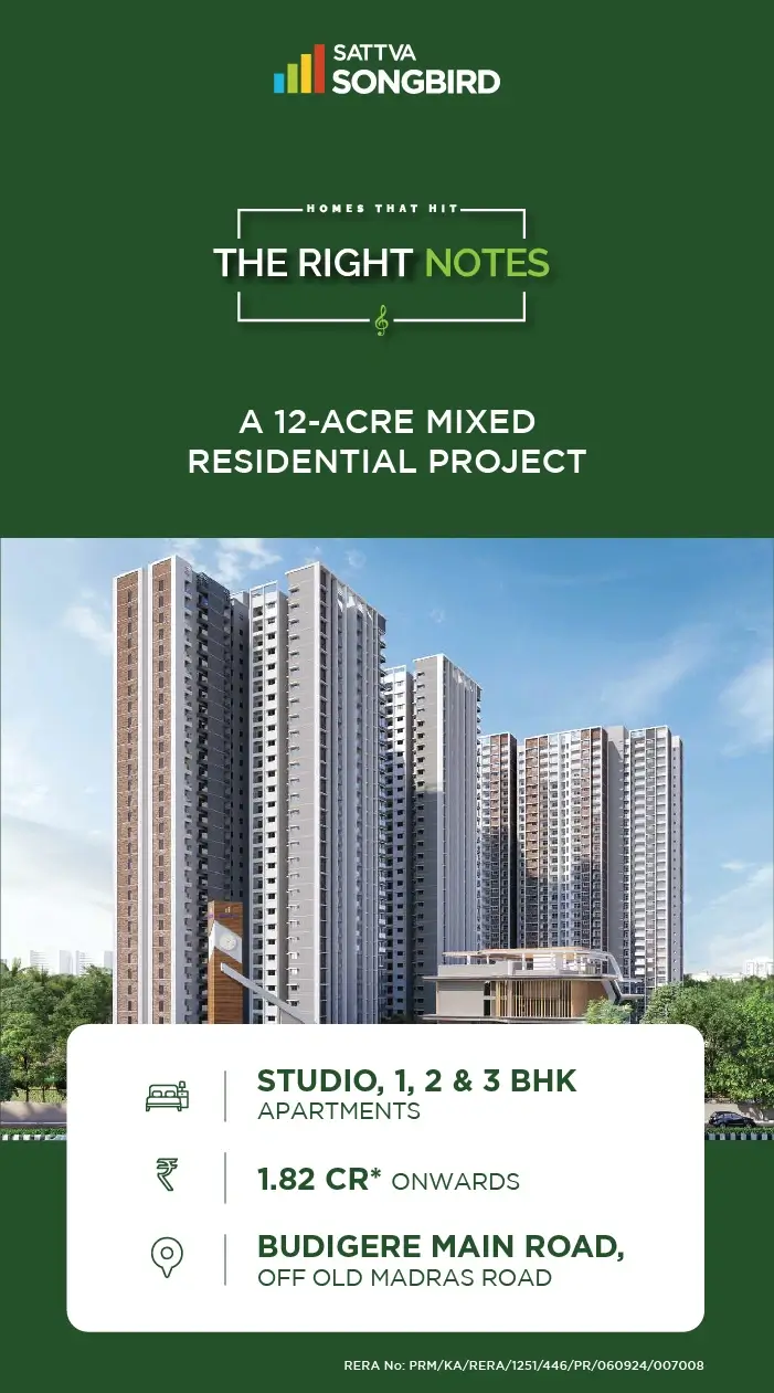 Located off Old Madras Road at Budigere Cross, Sattva Songbird offers the best of both worlds – accessibility and quietude. Enjoy seamless access to major hubs, with metro stations, IT parks, schools, hospitals, and shopping centres all within a short drive.